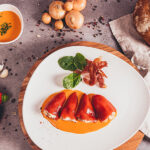Pimientos rellenos de nuestro relleno de carne de ternera local preparado con todo el cariño con el que elaboramos el resto de platos.