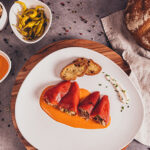 Ración de 4 pimientos con salsa de piquillos. Bandeja termosellada.
